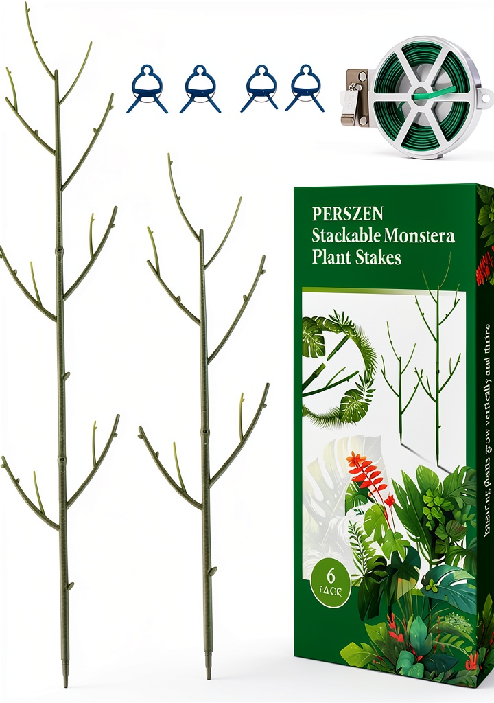 PERSZEN plastic plant stakes are designed to provide stable support for potted plants, featuring a unique branch-like shape that blends seamlessly with plant growth. Crafted from high-quality plastic, these stakes measure 7 inches wide by 16.54 inches high and weigh 0.38 kilograms, offering a classic, rectangular design with an unfinished finish. They require no assembly and are available in dark green and brown colors, with options for 6-pack or 15-pack sizes. Ideal for climbing plants such as succulents, roses, and orchids, these stakes ensure strong growth without damaging plant roots.